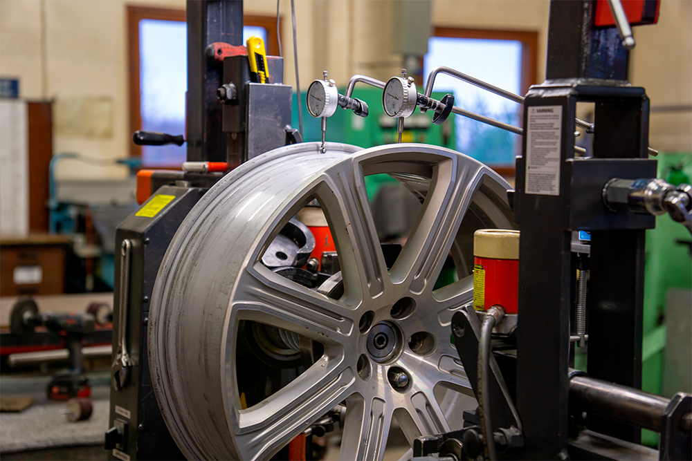 Käytössämme on K-MAK DORUK vanteen oikaisukone. Sähköhydrauliikalla toimiva laite on valmistettu ainostaan tähän käyttö-tarkoitukseen. Vanteen kiinnitys tehdään omien kiinnitysreikien mukaan ja keskitys on aina vanne ja autokohtaisen helan kanssa, näin saadaan tukeva ja tarkka kiinnitys oikaisukoneeseen.